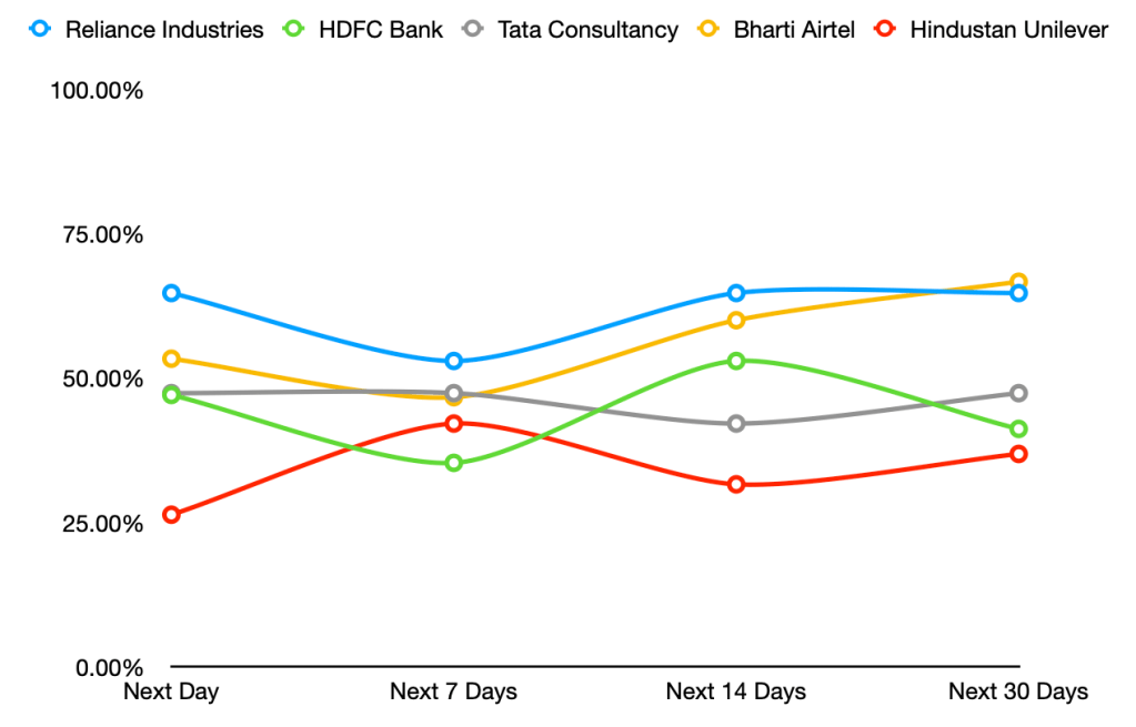 Once again, only slight correlation was seen—specifically in HDFC Bank, where the stock often fell before good results and rose before bad ones, showing a negative correlation. But since this pattern was observed in just one out of five stocks, it is not enough to suggest that short-term price movement consistently factors in the upcoming results.